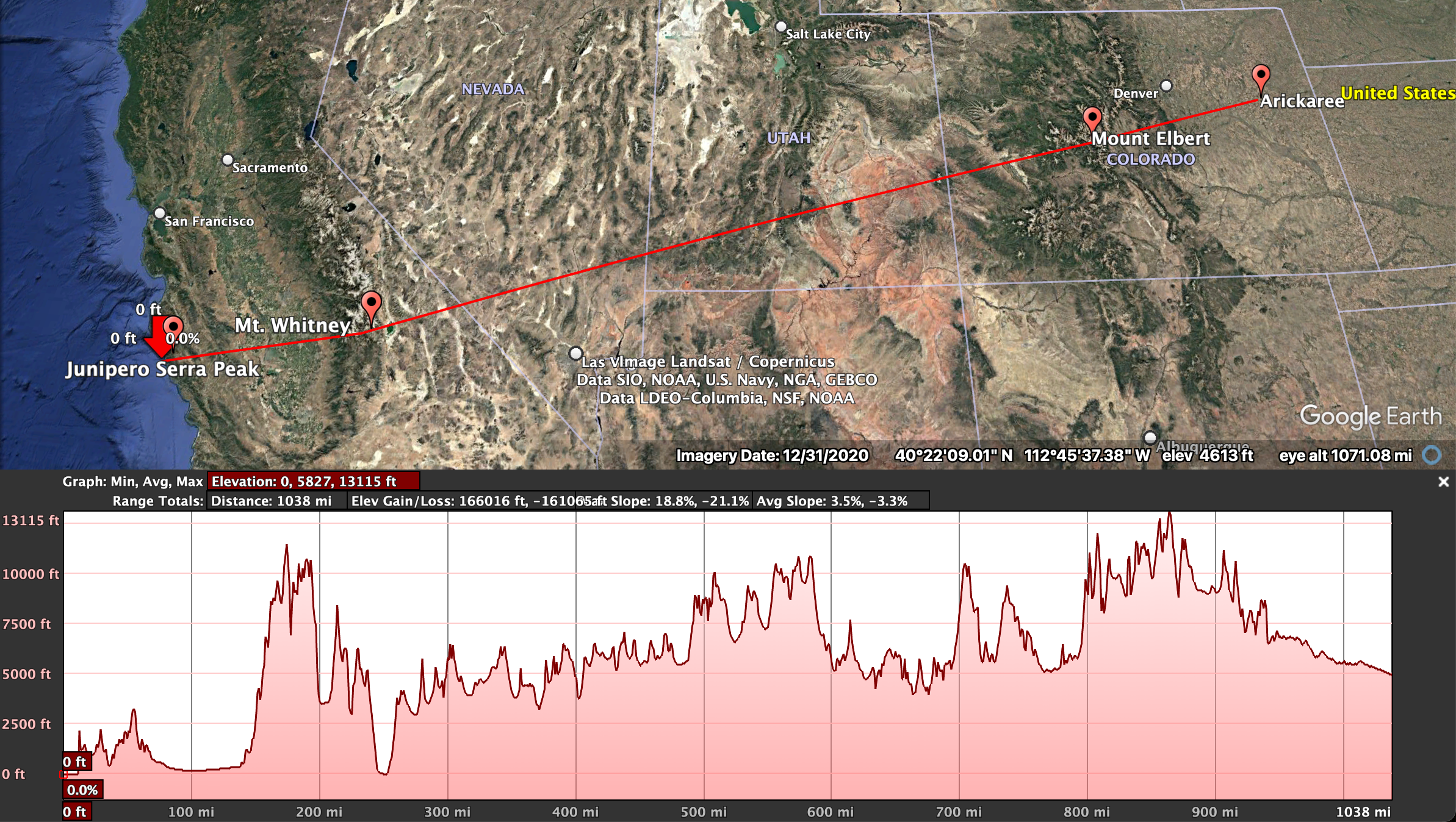 On a recent visit to the Rocky Mountains, I was struck by the quintessential triangles of the distinct peaks surrounding me. And upon uncovering the factoid that California hosts both the highest point in the continuous United States and the lowest point in North America a mere 130 kilometers (85 miles) away, I had to bring the two states next to each other for comparison. Mount Whitney at 4,421 meters (14,505 feet) exceeds the Coloradan Mount Elbert by only 21 meters (65 feet)!